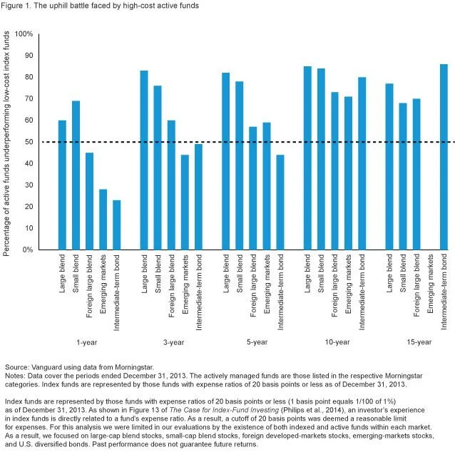 While we can perform many different tests, really the only one we need also happens to be the easiest—the sophisticated exercise also known as the eyeball test! If these markets were less efficient, we’d see a large portion—dare I say majority—of active funds outperforming not just their own benchmark, but also low-cost passive alternatives. However, in recently updated research on indexing, Vanguard found that once ”dead funds” (i.e., funds that were merged or liquidated) were included, 84% of actively managed small-cap U.S. funds, 73% of non-U.S. developed markets fund and 71% of emerging markets funds underperformed the average return of low-cost index funds in those same categories over the ten years ended 2013 (see figure 1. below). By my count, that’s three out of every four funds that failed to deliver on the theory that these markets are less efficient and therefore ripe for outperformance. Compare that to large-cap U.S. stocks, where 85% of funds underperformed.